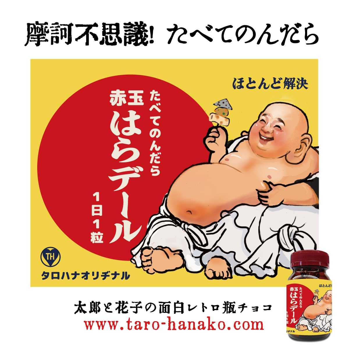 太郎と花子のオリジナルデザインの小瓶においしい糖衣コーティングのチョコ玉が入っています。
