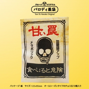 太郎と花子のオリジナルデザインのラベルを貼った小瓶においしい糖衣コーティングのチョコ玉が入っています。
