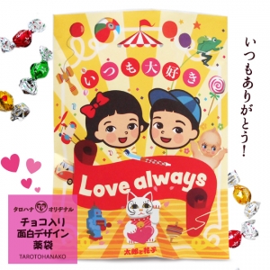 太郎と花子のオリジナルデザインのラベルを貼った小瓶においしい糖衣コーティングのチョコ玉が入っています。