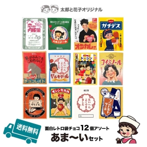 太郎と花子のオリジナルデザインのラベルを貼った小瓶においしい糖衣コーティングのチョコ玉が入っています。