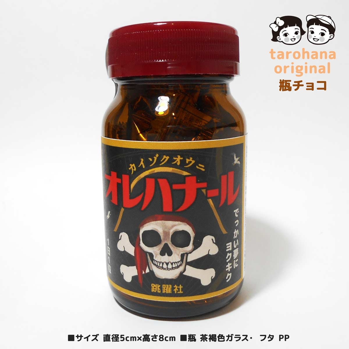 赤茶褐色のガラス瓶にチョコ玉が12個入っています。