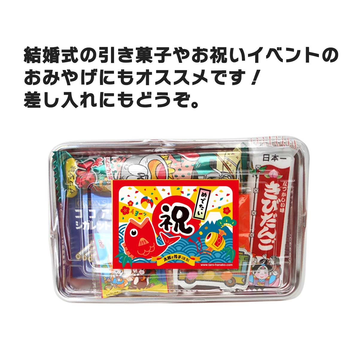 駄菓子の詰め合わせを、お弁当箱にセットしました。 お客様へのプレゼントにも最適ですよ! 子供会の参加賞や、学童保育のおやつ、ゲームやビンゴの景品にも喜ばれています。 種類は、「モダンタイプ」と「レトロタイプ」がございます。 お好みのタイプをお選びください。 ラベルは「通常版」・「感謝」・「めでたい」・「ハロウィン」・「クリスマス」「たいへんよくできました」からお選びください。 プレゼント用にリボンシール付き選べます。(追加料金10円/1個)